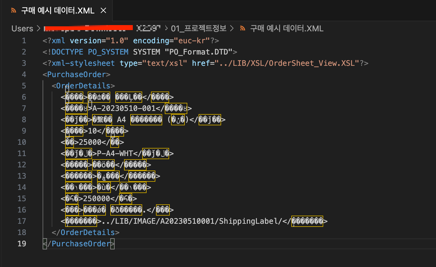VS Code에서 한글이 깨져 보이는 그 xml 파일을 그대로 엽니다.