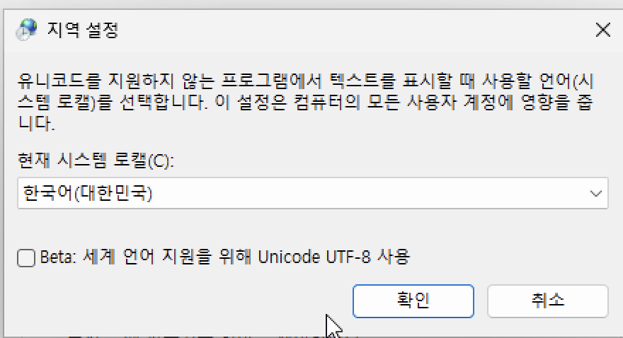2. 하단의 [Beta: 세계 언어 지원을 위해 Unicode UTF-8 사용] 체크박스가 반드시 '해제'되어 있어야 합니다.