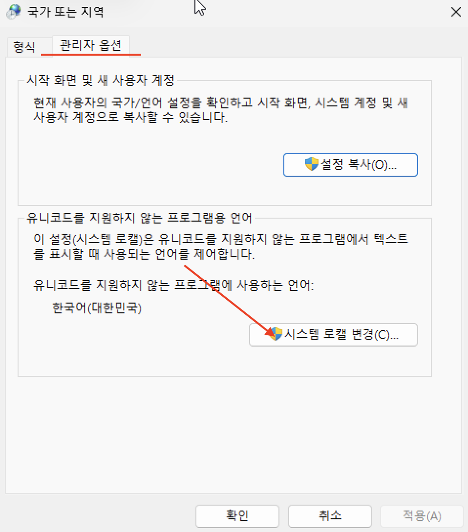 - 단계 4: 아래쪽에 있는 [시스템 로캘 변경(C)...] 버튼을 누릅니다.