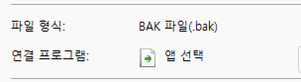 해결: .BAK 파일을 메모장으로 열어보세요. 바이너리 파일이라도 파일의 앞부분(헤더)에 원본 프로그램을 식별할 수 있는 텍스트(예: `AutoCAD`, `MS-SQL`)가 포함되어 있는 경우가 있습니다.