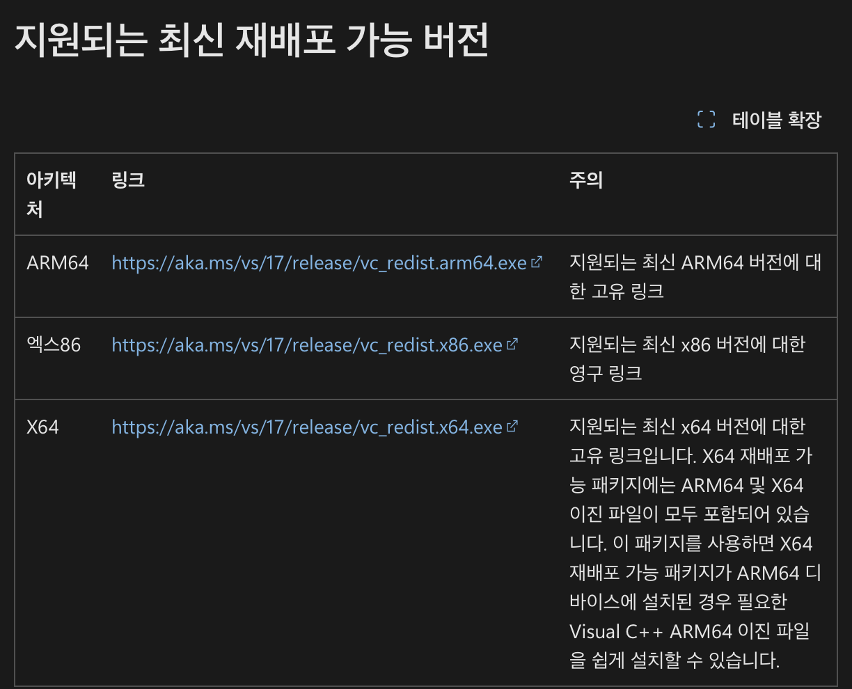 - https://learn.microsoft.com/ko-kr/cpp/windows/latest-supported-vc-redist?view=msvc-170