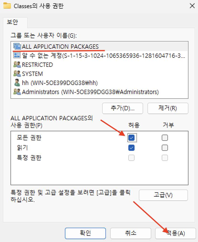 - 다시 '사용 권한' 창으로 돌아오면, 방금 추가한 'ALL APPLICATION PACKAGES' 항목이 목록에 보입니다. 이 항목을 클릭하여 선택합니다.